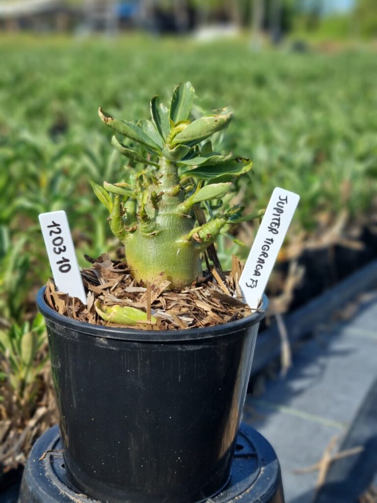 Adenium arabicum F3 cultivar Jupiter Tigrada — semente selecionada, rosa do deserto com caudex imponente para colecionadores.