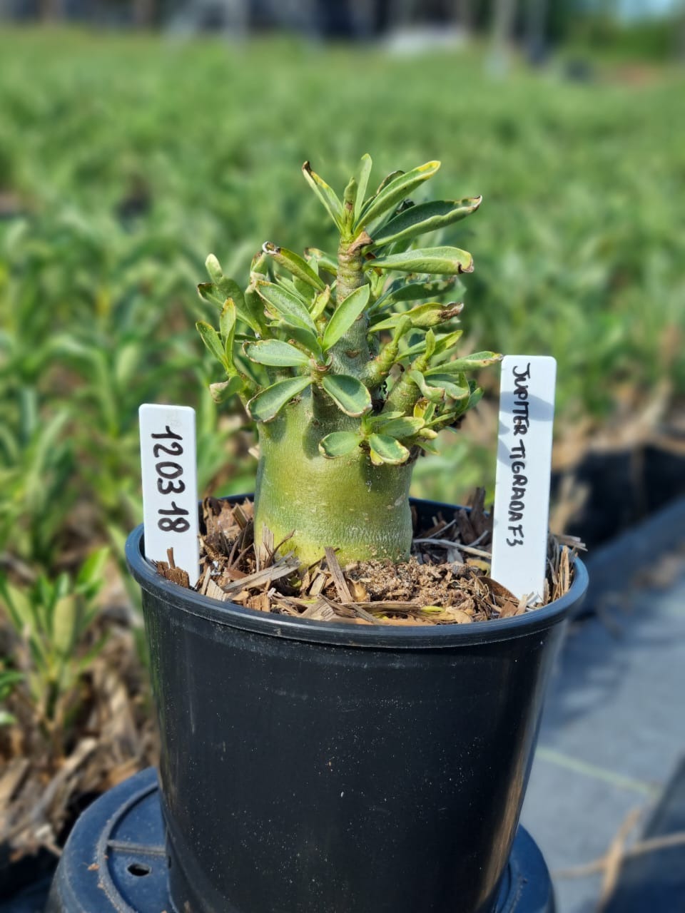 Adenium arabicum F3 cultivar Jupiter Tigrada — semente selecionada, rosa do deserto com caudex imponente para colecionadores.