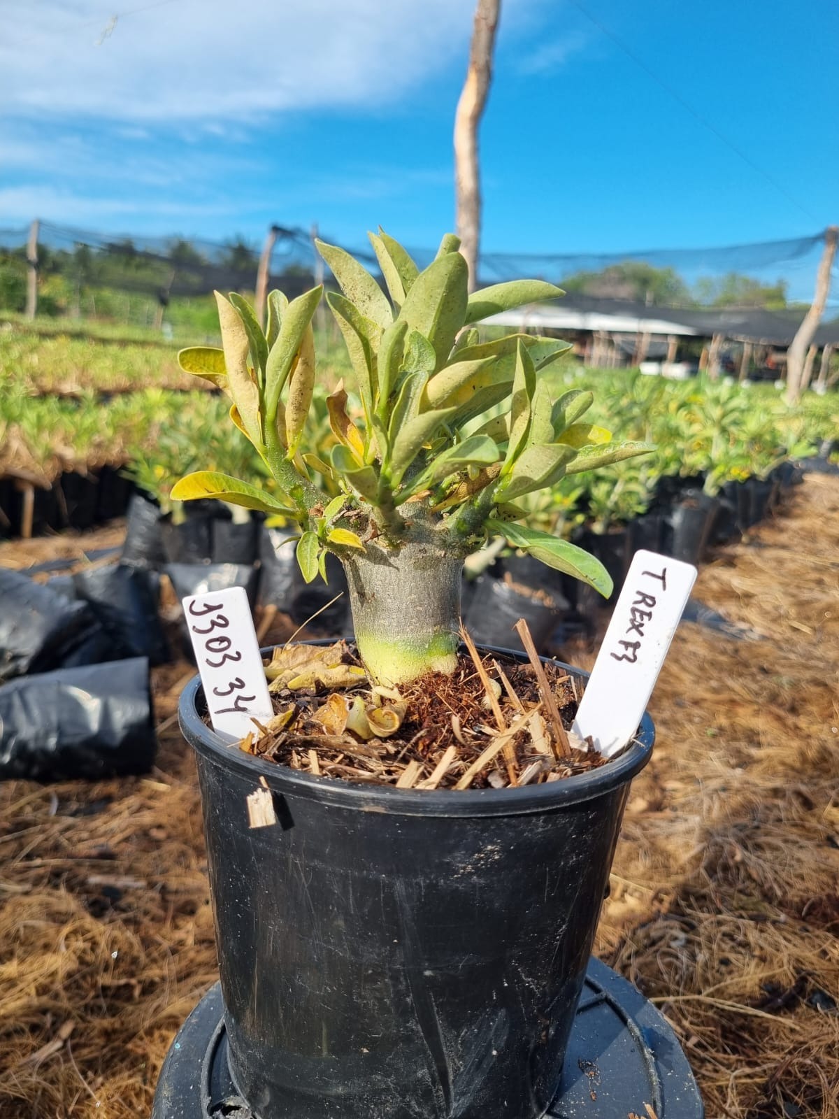 Adenium arabicum F3 cultivar T Rex — semente selecionada, rosa do deserto com caudex imponente para colecionadores.