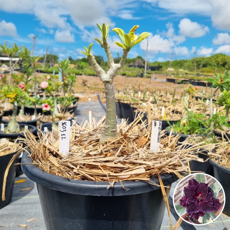Muda Baobá Baby com caudex em formação do adenium rosa do deserto cultivar Ceu Estrelado Variegata, perfeita para colecionadores apaixonados!