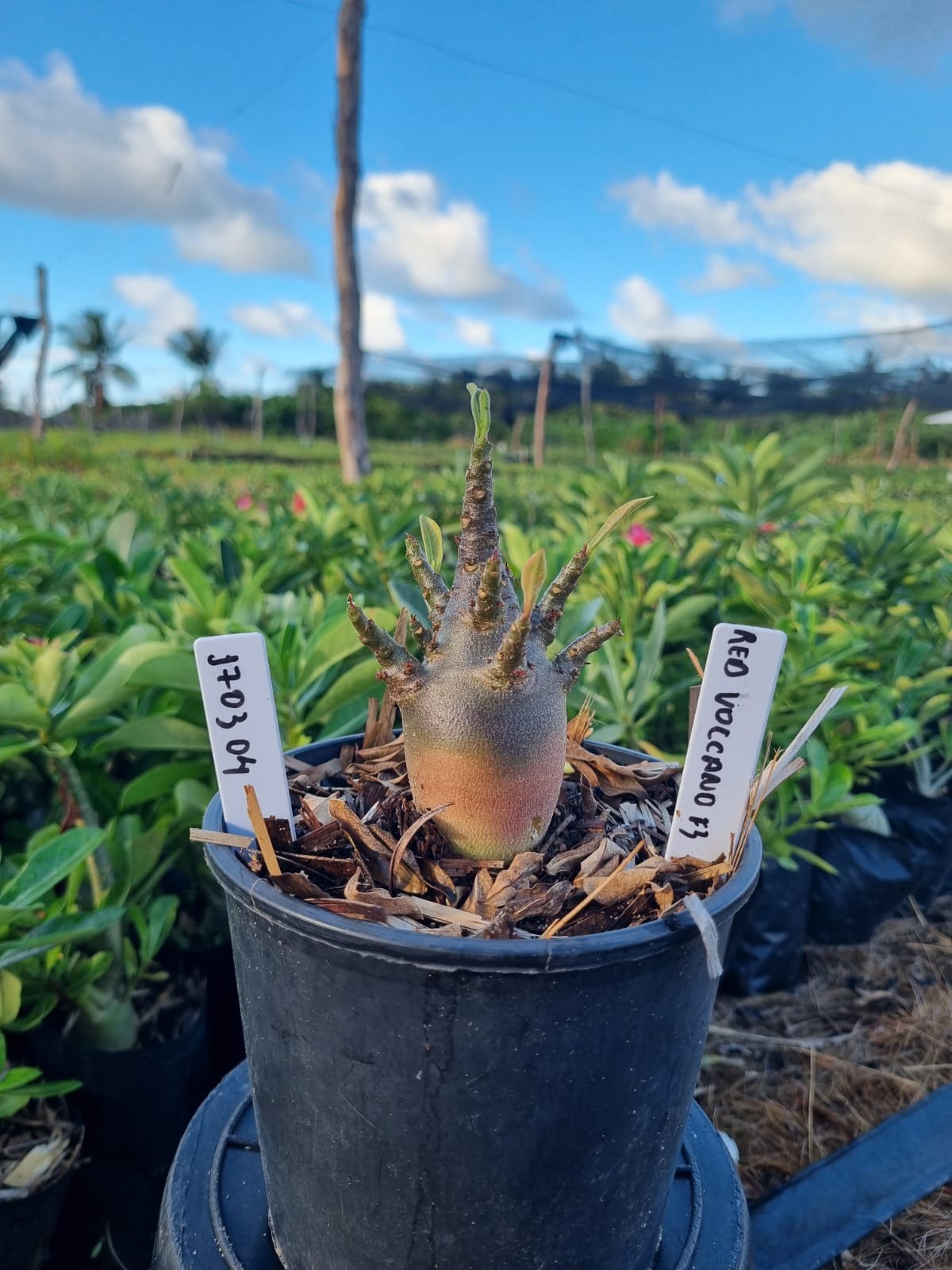 Adenium arabicum F3 cultivar Volcano Red f3 — semente selecionada, rosa do deserto com caudex imponente para colecionadores.