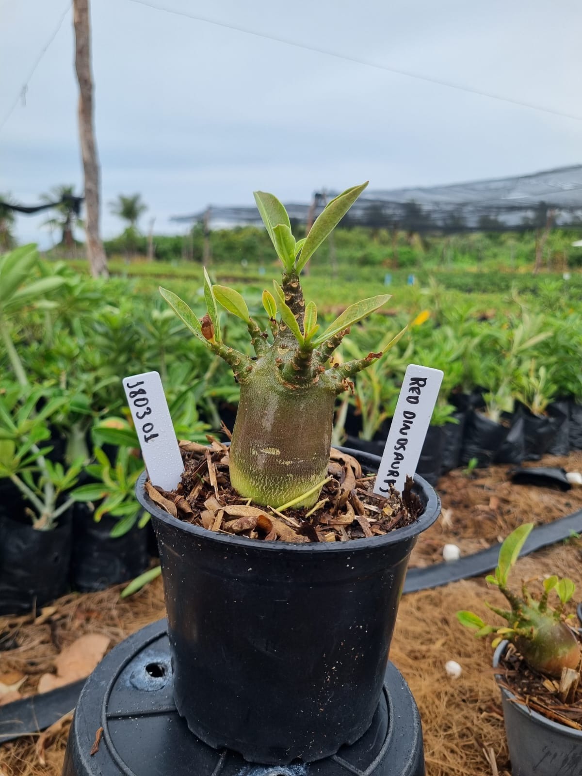 Adenium arabicum F3 cultivar Red Dinosaur — semente selecionada, rosa do deserto com caudex imponente para colecionadores.