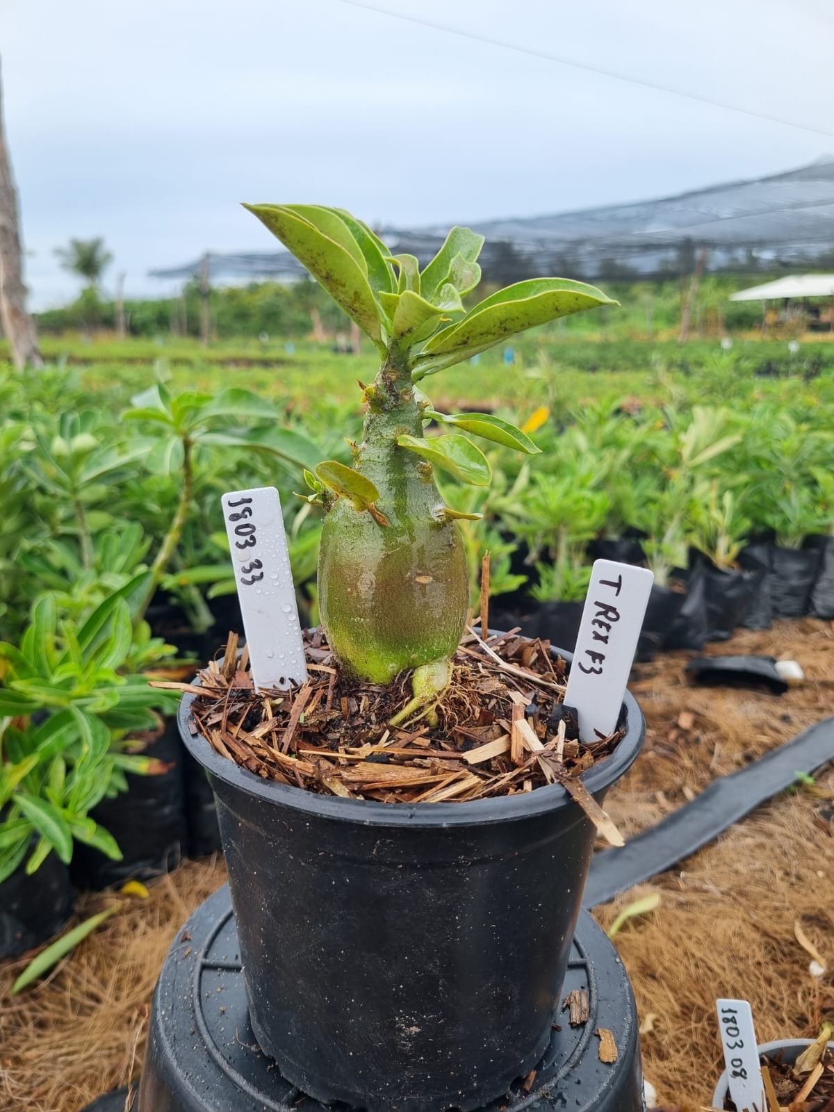 Adenium arabicum F3 cultivar T Rex — semente selecionada, rosa do deserto com caudex imponente para colecionadores.