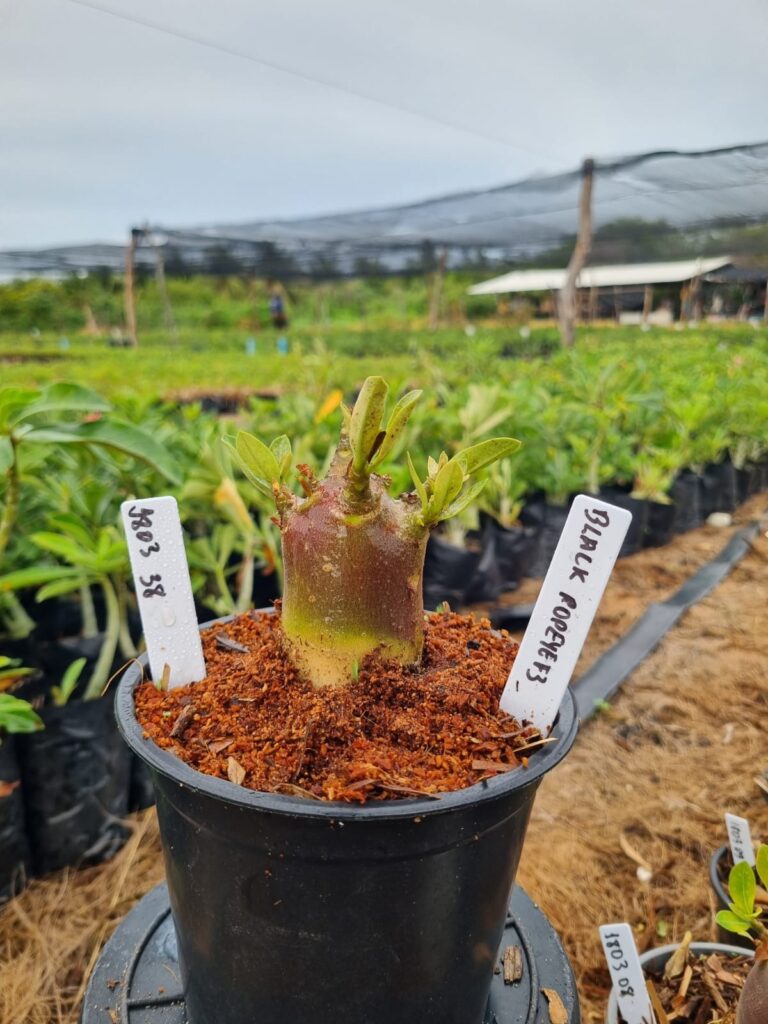 Adenium arabicum F3 cultivar Black Popeye — semente selecionada, rosa do deserto com caudex imponente para colecionadores.