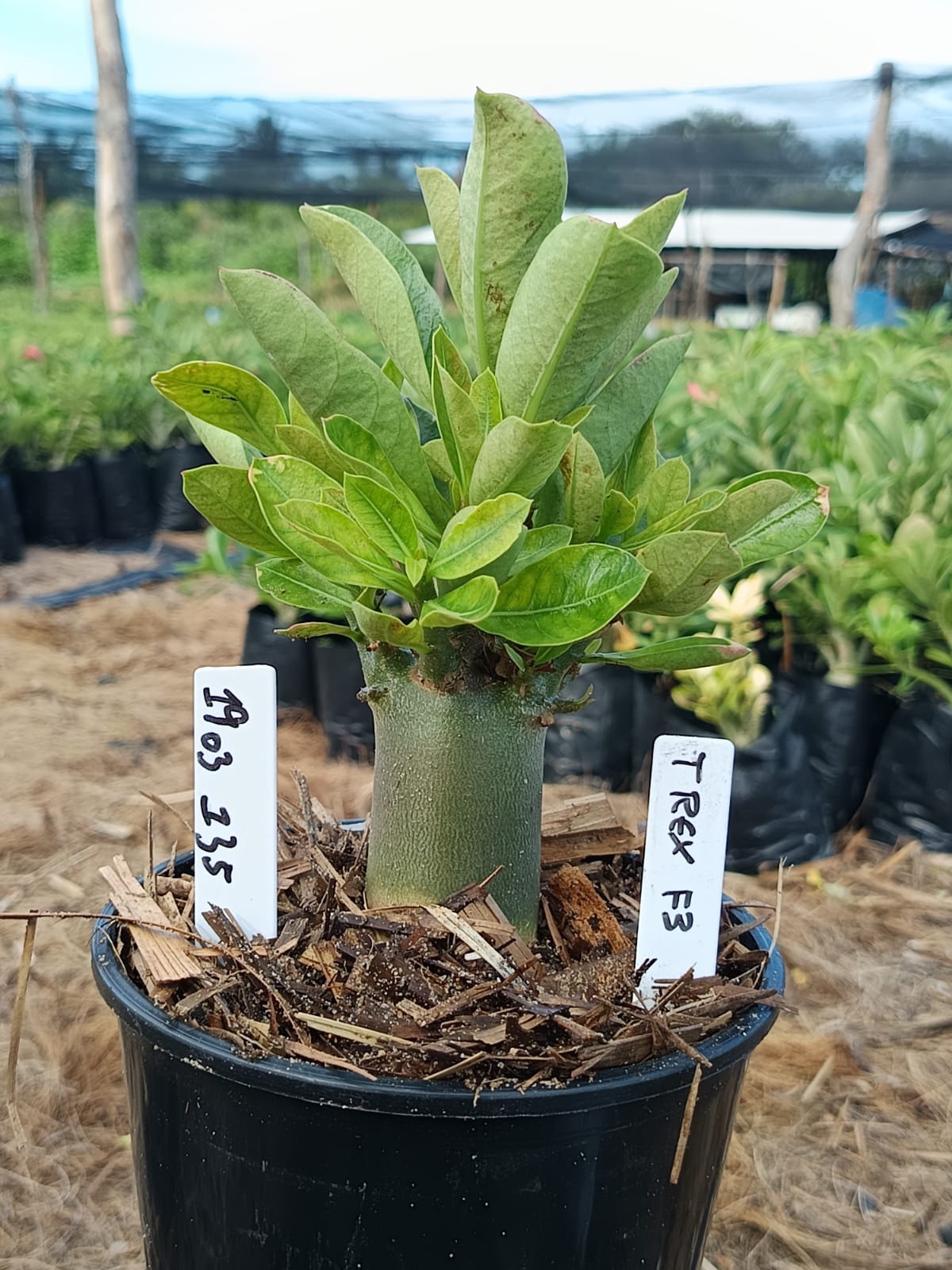 Adenium arabicum F3 cultivar T Rex — semente selecionada, rosa do deserto com caudex imponente para colecionadores.