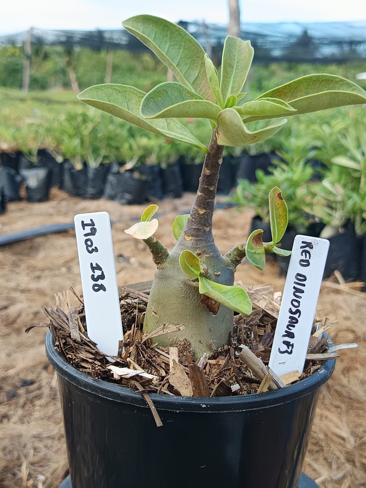 Adenium arabicum F3 cultivar Red Dinosaur — semente selecionada, rosa do deserto com caudex imponente para colecionadores.