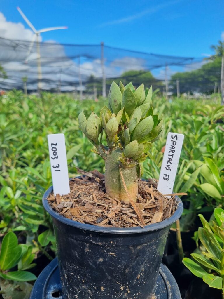 Adenium arabicum F3 cultivar Spartacus F3 — semente selecionada, rosa do deserto com caudex imponente para colecionadores.