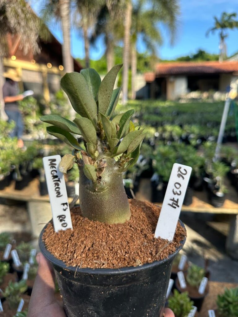 Adenium arabicum F3 cultivar MeGaTeon F3 R0 — semente selecionada, rosa do deserto com caudex imponente para colecionadores.